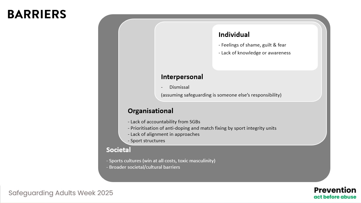 Negative sports cultures such as ‘win at all costs’ mentalities and toxic masculinities create societal barriers to preventing abuse. These ideologies are often viewed as required for sporting success, and this normalisation creates resistance not only to change, but even to accepting there’s a problem.
