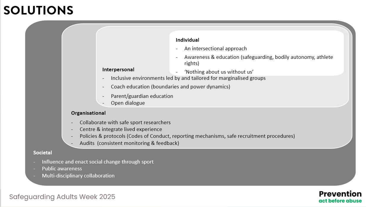 Emma used the socio-ecological model to show how everyone has a role to play in preventing abuse against adults in sport. She discussed both barriers and solutions on individual, interpersonal, organisational and societal levels. In particular, she emphasised the importance of tackling this issue on a societal level: