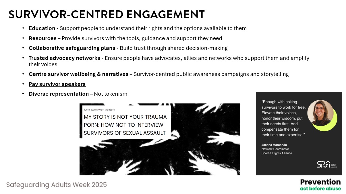 Emma also discussed how sports organisations can engage with people with lived experience of abuse in a survivor-centred way. She drew from her experience as a survivor and advocate who has contributed to the development of international safe sport frameworks. She also discussed her negative experiences in sharing her story with journalists.